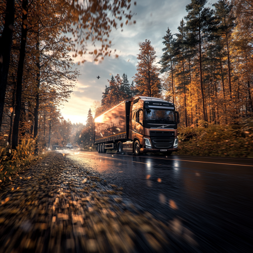 A crisp November evening in a scenic forest with golden and red autumn leaves, a path covered in fallen leaves under a cool sky with the sun setting low, warm orange glow reflecting on the leaves, slightly foggy for an atmospheric effect, detailed and realistic with high contrast.