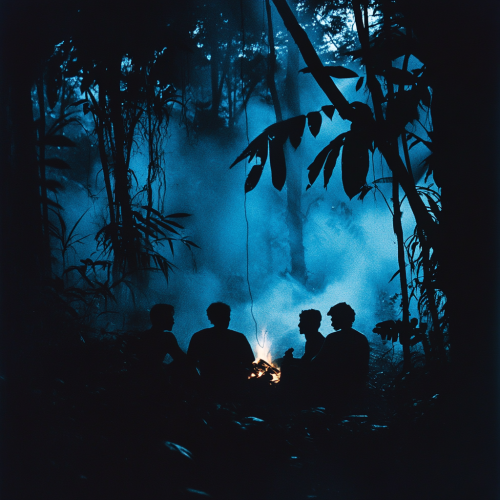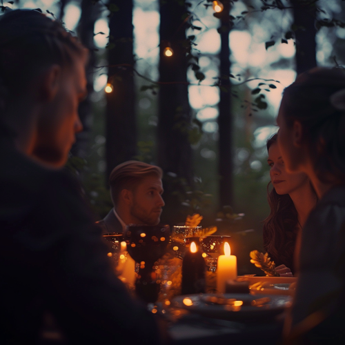 Guests enjoying a peaceful dinner in a forest with a light breeze and soft ambient music, close-up of thoughtful faces, gentle evening lighting, trees swaying in the background, realistic photo --v 6.0 --s 50