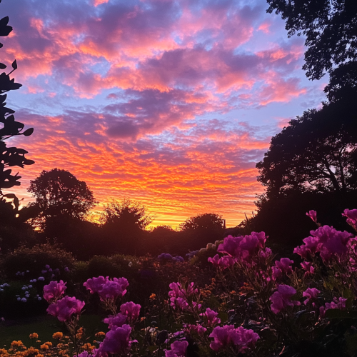 A stunning sunset over a beautifully landscaped garden, with silhouettes of flowers and trees, and the sky painted in vibrant shades of orange, pink, and purple taken with an iphone 15 pro