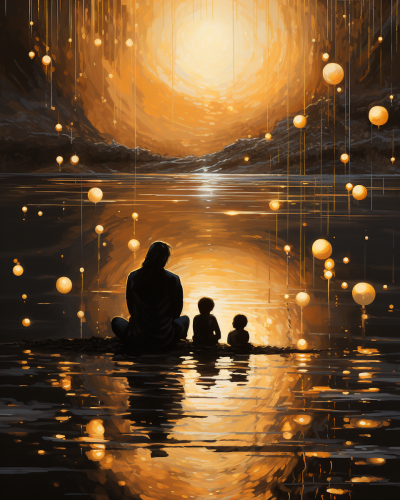illustration of a two gold silhouettes of Caviidae, sitting on the shore of a golden sunset, golden sparks, golden sparks, gold textures, gold rocks --s 250 --ar 4:5