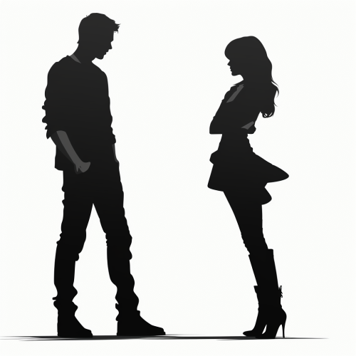 silhouettes of a man and a woman in love positions, standing, waman in skinny clothes with narrow waist and with expressive body shapes, flat image, black and white, full-length images of people