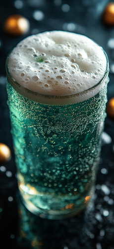 Close-up of mint green beer foam with water droplets on a glass, the foam is very thick, high resolution, highly detailed, stock photo, two-thirds body view. --ar 59:128 --s 800 --v 6.1