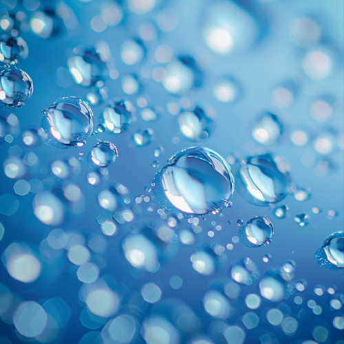 A close-up of multiple water droplets against a delicate light blue background, arranged in a pleasing pattern. Each droplet is highly detailed with visible reflections and highlights. The background is a soft, blurred light blue, creating a calm and refined effect. Soft lighting enhances the droplets’ clarity and sparkle. Created Using: Photorealistic, detailed droplets, blurred background, soft light, hd quality --v 6.0