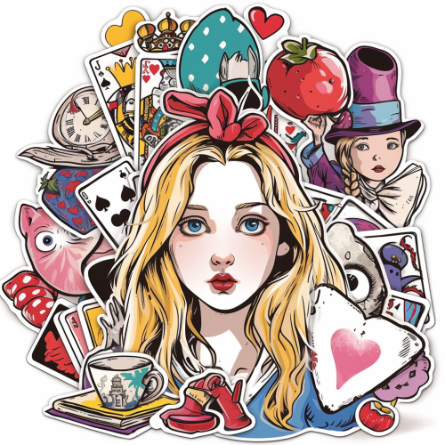 alice in wonderland, full body, bold outline, sticker art, detailed, vector, contour, bright colors, white background. --c 15 --v 6.0