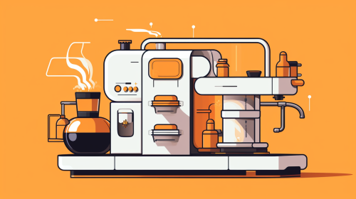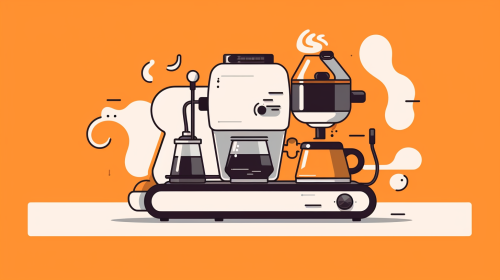 an orange, white and black hero image with a small 3d cartoon outline illustration of a coffee brewing machine brewing content for social media and digital marketing. clean and minimal. --ar 16:9