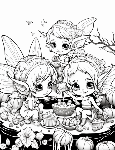 Faries having a Halloween party Black and white only. Outline only. --ar 85:110 --style raw --v 5.2 --s 50