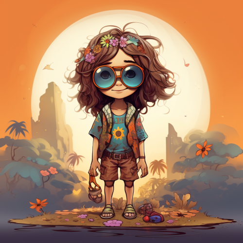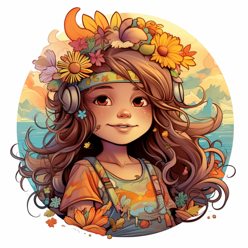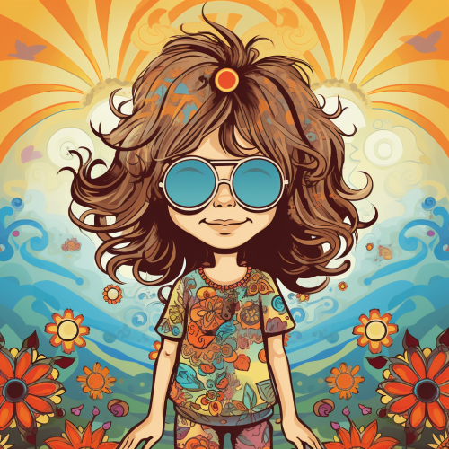 A vibrant Volkswagen hippie van adorned with colorful floral patterns and peace symbols, cruising down a scenic country road towards Woodstock in the late 1960s. The van’s cheerful design reflects the spirit of the era, with flowers painted across its sides and a tie-dye roof catching the sunlight. Lush green fields and wildflowers line the road, and in the distance, the silhouettes of excited festival-goers can be seen gathering. The warm glow of the setting sun bathes the scene in a golden hue, capturing the essence of freedom and love that defined the Woodstock generation. --ar 9:16