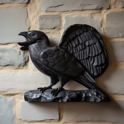 A carved falcon shape protrudes from a stone wall black with a shelf inside