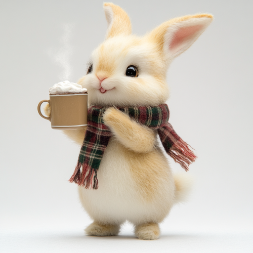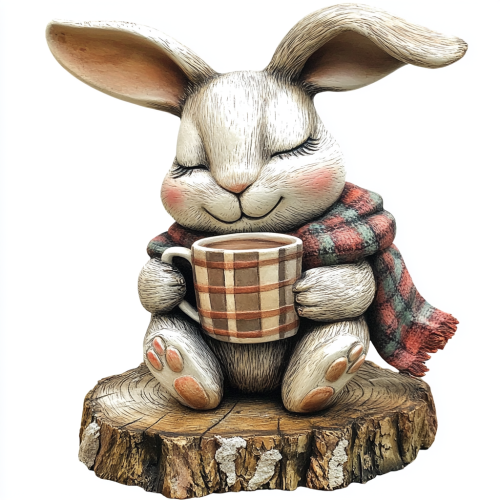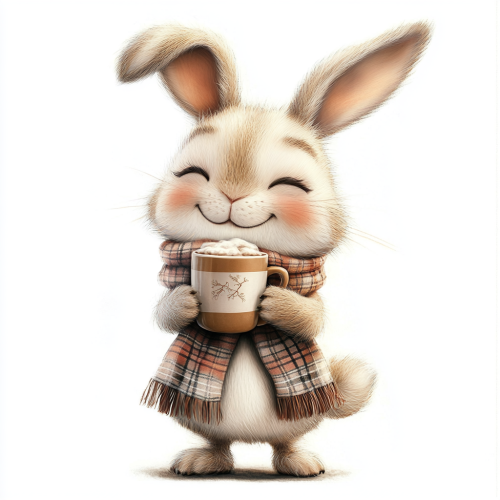 photo of cute happy bunny, full body, standing upright on hind legs, hoisting up a mug of hot chocolate, bunny is smiling, wearing a plaid scarf, view is 3/4 side profile, white background