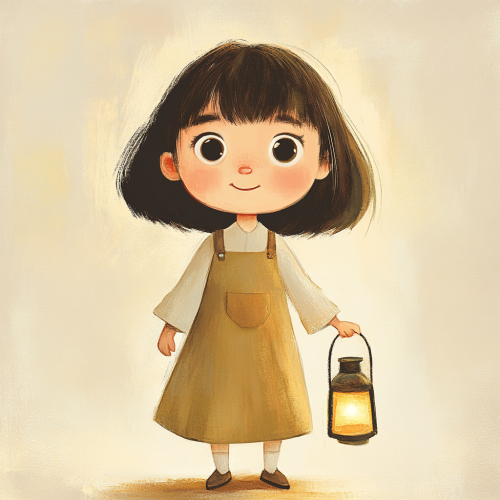 Children’s book illustration (The Heroine, 6 years old, Courageous and Kind) • Inspiration: Drawing from Hilda and Studio Ghibli protagonists like Chihiro (Spirited Away) and Kiki (Kiki’s Delivery Service). • Design Notes: • Body Shape: Keep Kaira’s body slightly round and soft, with childlike proportions (large head, shorter limbs). She should look both innocent and brave, to appeal to younger audiences. • Face: Large, expressive eyes, a small nose, and a gentle smile. Her eyes should reflect her emotions strongly--whether wide-eyed with wonder or narrowed in determination. Soft, rounded cheeks emphasize her youth. • Hair: Simple but distinctive. Perhaps loose and flowing, with strands that glow when she’s being brave. You could add a touch of light in her hair to visually connect her to the lantern. • Clothing: A simple dress or tunic in earthy, warm tones like gold or soft green to tie her to nature and light. A small belt with a pouch where she keeps her lantern when she’s not holding it. You can add small boots or sandals for a down-to-earth, adventurous feel. • Pose and Expression: Focus on wide stances and open arms to express her courage and eagerness. She should always look like she’s ready for the next adventure.
