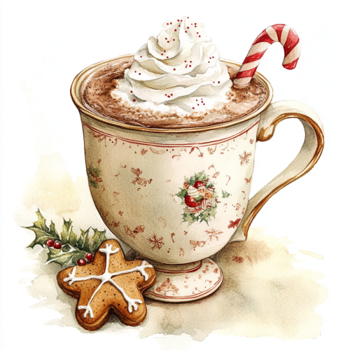 an aestetic highly detailed watercolor hot chocolate with whipped cream and a small gingerbread cookie and a sugar candy cane in a big ceramic christmas themed mug