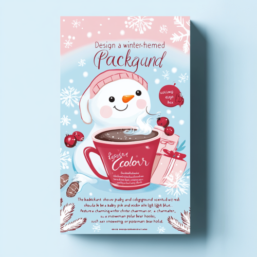 "Design a winter-themed packaging box with an elegant and cozy feel, using a baby pink and light blue color palette, accented with red. The background should be a frosty light blue. Feature a charming winter character, such as a snowman or polar bear, holding a steaming cup of hot chocolate in the center of the design. The character and cup should be illustrated in baby pink and red, with soft light blue accents for the cup. Surround the character with delicate snowflakes, icicles, and red berries to enhance the winter theme. Include subtle illustrations of winter mittens and gift boxes in baby pink along the borders. The brand name should be prominently displayed in a stylish cursive font in white or light gold, with product details in red beneath it. Add a thin, embossed red trim for a refined touch. The overall design should be festive, warm, and inviting, combining playful winter icons with a soft, seasonal color palette."
