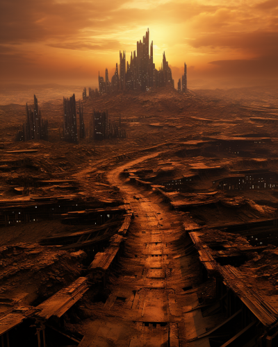 Landscape birds eye view, directly from above straight looking vertically down, blade runner landscape orange tint, dystopia, wrecked, pyramids cyber, a character near a dystopic cars blade runner style, landscape, hyper realistic, dark, blade runner, hyper realism --ar 4:5 --v 5.2