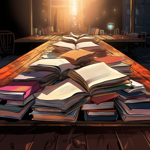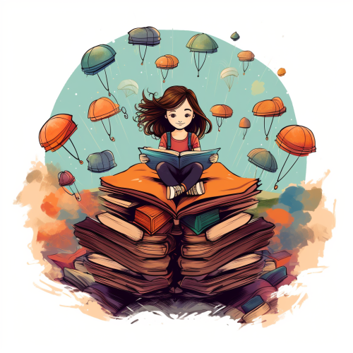50s style comic book illustration of a girl reading piles of books, retro-futurism --ar 16:9 --s 250 --v 5.0