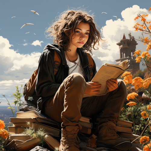 daylight background, girl sitting on top of a hill reading books hyper realism --s 750