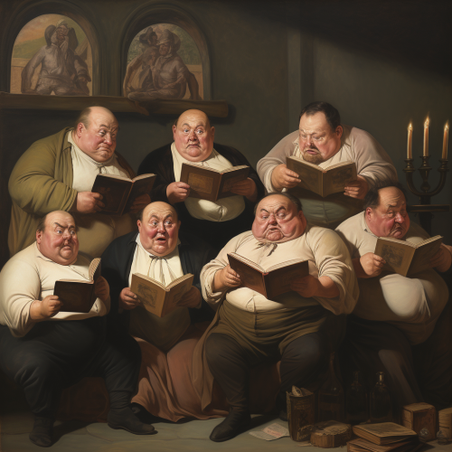 10 fat scholars sitting side by side reading books with mouth open --v 5.2