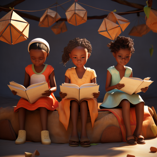 3D low poly haitian school kids reading books, CG, animated, low polygon character render, candid photo