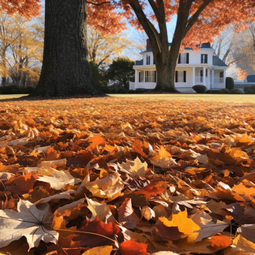 Crisp fall leaves on a new england front lawn, uhd, realistic, zoomed in