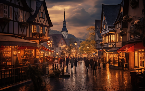 A German town at dusk, seeing warm light from windows, people walking and living, in the style of redshift, fairytale-inspired, dark orange and light bronze, landscape inspirations, national geographic photo --ar 16:10