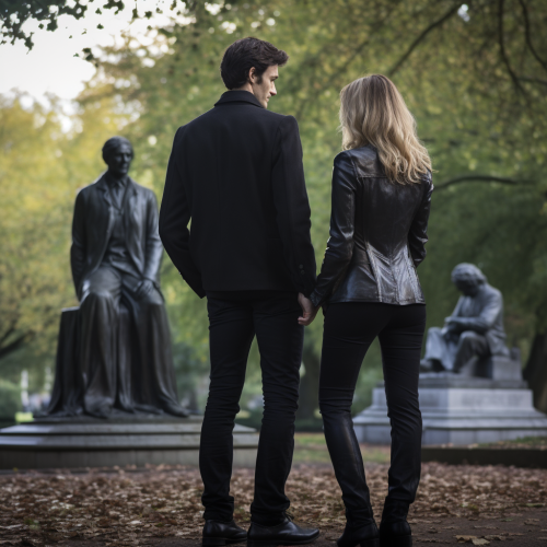 white man in suit, aged 40, slim, short dark hair, stood closely next to woman wearing black jeans and short jacket, long blonde hair, back view, in a park with a large statue, dusk