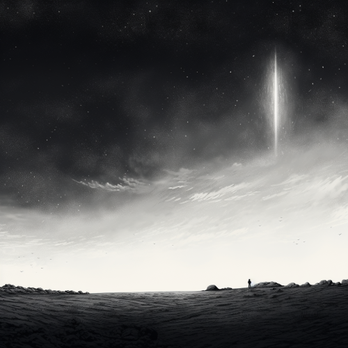 black and white illustration of distant sky in black universe space, black and white illustration, graphite, minimalistic, washed-out, hand-drawn