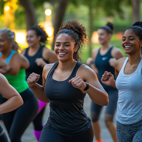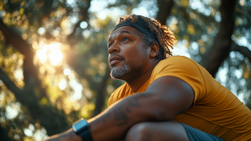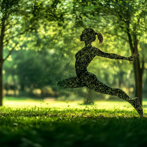 A person in a lush green park performing different exercises--jogging, stretching, and practicing yoga--with their mental stress visually dissolving into the air, symbolizing the holistic mind-body benefits of exercise.