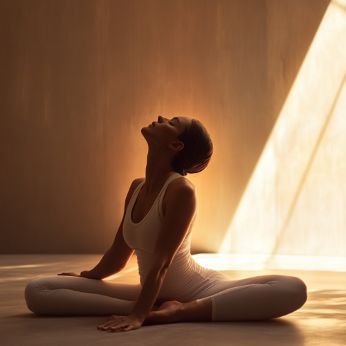 A person performing deep stretches in a quiet studio with soft, warm lighting, their body relaxed, and muscles tension-free, symbolizing the calming effect of flexibility exercises on stress.