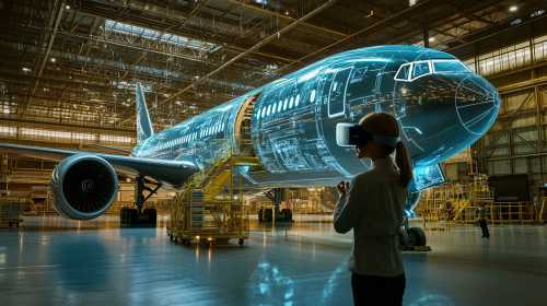 ultrarealistic, futuristic, a person wearing VR Goggles in a warehouse, in front of them is an Augmented Reality projection a VIP custom luxury interior of a boeing 777 widebody aircraft, 8k, --ar 16:9