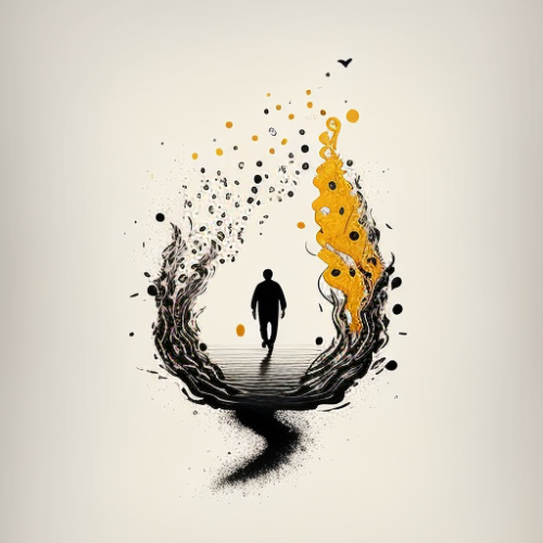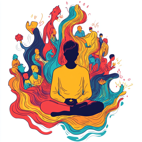 Person practicing mindfulness with colorful waves and supportive figures.