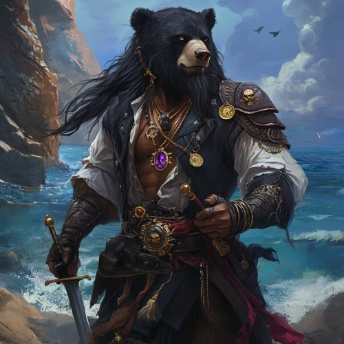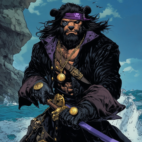 male pirate, long black bear, black eyes, long black hair to shoulder, ring on every finger, black pirate clothing, eye patch, necklas with purple coin around neck, holding sword with golden handel, standing on a clif, sea background.