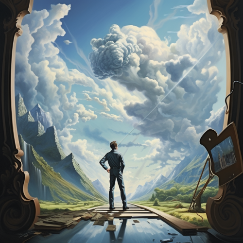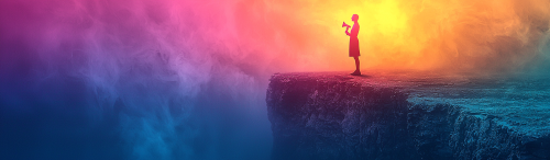 "A powerful and inspiring scene showing a person standing confidently on a cliff or high vantage point, looking out over a vast and expansive landscape. The sky is filled with vibrant colors, symbolizing potential and possibility. The person’s posture and expression reflect strength and determination. In the foreground, uplifting words are artistically integrated into the scene: 'You possess more strength than you realize, greater courage than you feel, and more potential than you can imagine. True success comes from believing in yourself and your abilities.' The overall atmosphere conveys empowerment and the boundless potential within." --v 6.0 --ar 2:3
