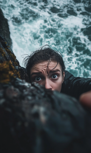a person looking at the camera, they are looking at the camera, facing the camera, you can see their face, their face is in view and they are looking at the camera, it is at the camera they are looking, the camera they are looking at is above them,someone holding on to the edge of a cliff, they are looking up at the camera which is above them, they are looking at the camera above them and you can see their scared face, they are scared and looking up at the camera which is above them the camera is above them and they are scared, above choppy sea water, they are scared, stormy spooky dark weather, hyper realistic, ultra realistic, photoreal, 4k, 8k, --ar 3:5