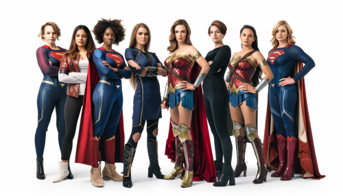 photo realistic, group of woman super heros of all ages and demographics standing close together, they are professional business woman and experts in the deep tech industry, white background, zoomed out to show full bodies --ar 7:4 --v 6.0 --style raw