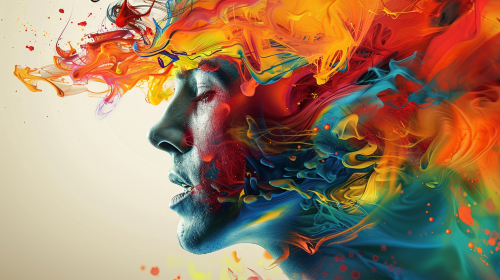 Generate a digital art for Digital art of a person standing confidently on a stage, facing an audience, with thought bubbles showing gears and lightbulbs to represent critical thinking and clear communication. The background is a soft white color, and the scene is illuminated with a spotlight effect. --ar 4:3 --quality .5