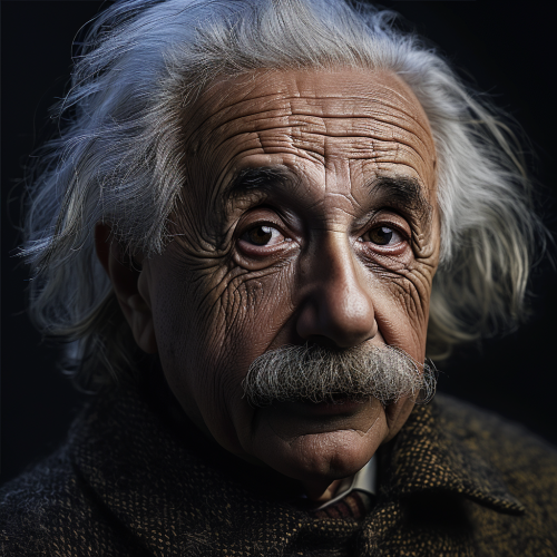 /Prompt Albert Einstein front portrait, looking into the camera, color photo of the upper third of the body, black background. Shot with Canon R5, 70–200mm, cinematic studio lighting, strong shadows, photographed by Bert Stern, 8k UHD --v 6.0