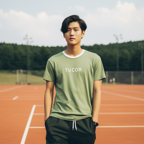 photo real product mock up for etsy 17 year old korean male, at a tennis court, wearing a green tshirt. Scene should be in the style of an urban outfitters advertisement, he is pleasant and happy