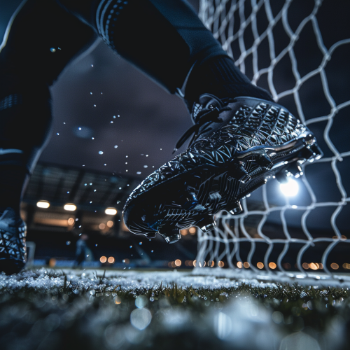 goalkeeper in black jersey saving goal in goalpost , bottom ant view close up black shoes, photograph, natural dynamic dark lighting, stadium goalpost night background --s 250 --v 6.0