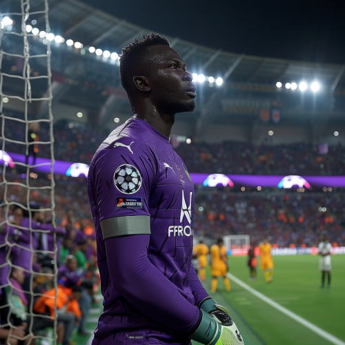 Nigerian goalkeeper, Efe Odita, standing in front of the goal, wearing a bright green Fiorentina goalkeeper kit, medium-length black hair, muscular build, dark skin, 188cm tall, 76kg, focused on the game, realistic, taken with a 400mm f2.4 lens, full stadium crowd, evening match --v 6.0 --s 750