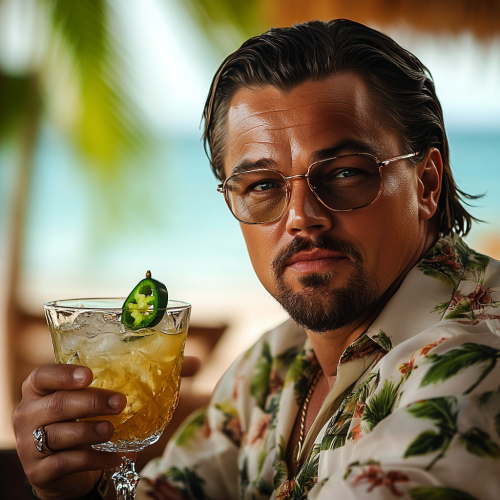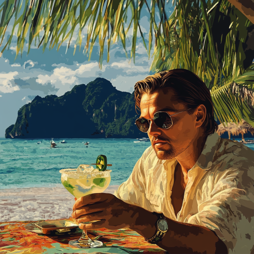 Leonardo Dicaprio from the movie the beach enjoying a tommy margarita with a jalapeno as a garnish by the beach in Koh Phi phi, make it in a retro ambient style design