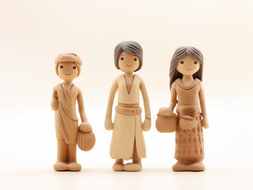 feature image for clay figurine ecommerce collection of ancient boy, lady and travelling man figurines, beige and natural colours, modern clay figurines --ar 4:3