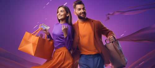 a hero image for an eccomerce site, featuring a couple very happy at home with shopping bags, the couple should be photorealistic just the upper bodies, the background shoul be purple with orange vector accents with vector electronics featuring digital shopping, the image shoul be modern, minimal, appealing, bright --ar 16:7