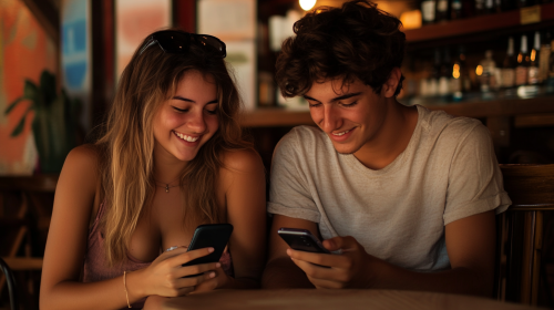 large view young Brazilian women and men, 19 years old, looking at his cell phone in coffee, very happy, nice brightness, full of colors, no flaws, photorealistic, photo stock, hyper realistic, photography for learning application --ar 16:9 --v 6.1