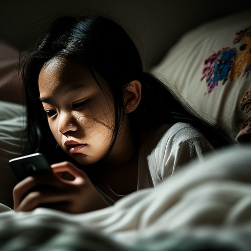 a asian girl 18 year old lying down playing with mobile phone in bedroom , blurry background,Very realistic photo ,full body portait ,photograph realistic, intricate detail, professional photography, brightly light , serene faces, zeiss batis 18mm f/2.8 --v 4