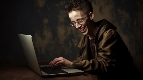 realistic photo, blind young people, visual disability, happy, using laptop, detailed photo --ar 16:9