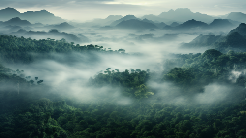 Africa from above equatorial jungles shrouded in mist, bordering the savanna --ar 16:9
