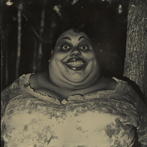 a 1920 wetplate photo of an enormously obese woman with a throat as big as her head, a huge double chin and terribly bulging eyes, she smiles, the photo is taken at night in the forest