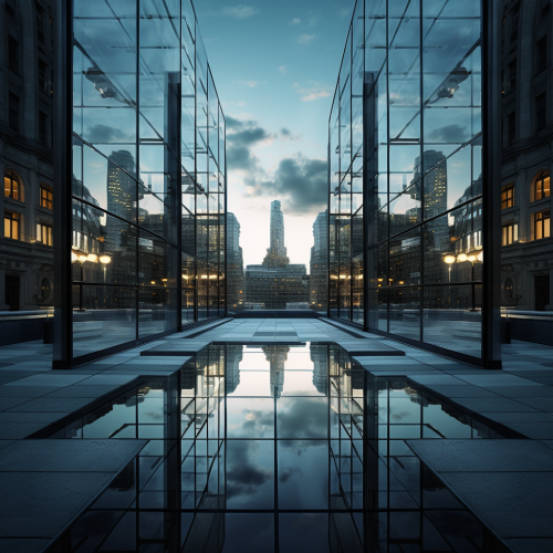 Photorealistic $100 Bills in Air, Glass Building Background