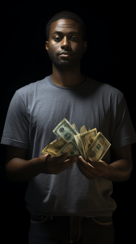 man holding his gut with one hand and holding 100 $100 bills in the other --ar 9:16 --v 6.0
