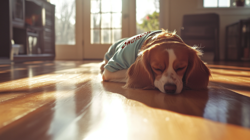 An ultra-realistic photograph taken with a Sony Alpha 7 III - Full-frame Interchangeable Lens Camera & Lens Kit 24.2MP, 10FPS, 4K/30p. The image features a dog wearing a soccer jersey with the name "Swanson" clearly visible on the back. The dog is resting its head gently on a polished wooden floor in a bright, sunlit house. The natural light streaming through large windows highlights the dog's fur and the texture of the wooden floor, creating a warm and inviting atmosphere. The room is filled with soft, diffused light, enhancing the vivid colors and sharp details of the scene. The background remains slightly blurred to keep the focus on the dog, emphasizing the peaceful and relaxed moment captured in this bright, comfortable setting. --v 6.1 --ar 16:9