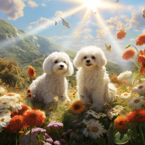 hyperdetailed, dreamy scene of a maltese dog and a black bichon poodle dog, seated next to each other , , on a beautiful sunny flower fields in the background, realistic to maximum details , ultra-detailed.